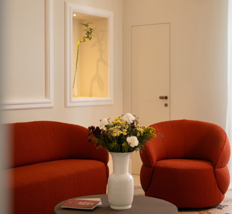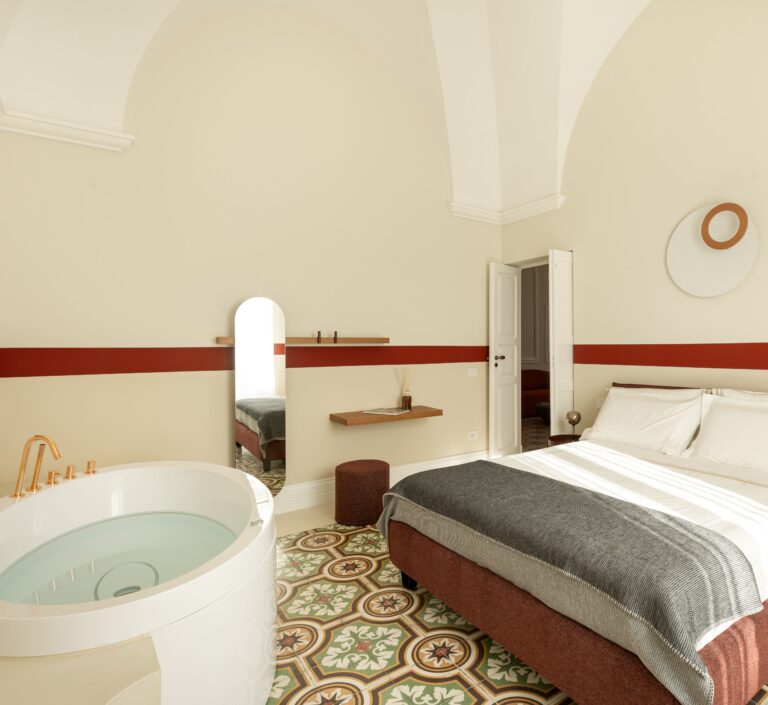 Gli spazi interni di Palazzo Melogna rappresentano la traduzione più autentica del concept progettuale: una fusione armoniosa tra identità pugliese e contemporaneità, dove materiali, colori e arredi dialogano in equilibrio.