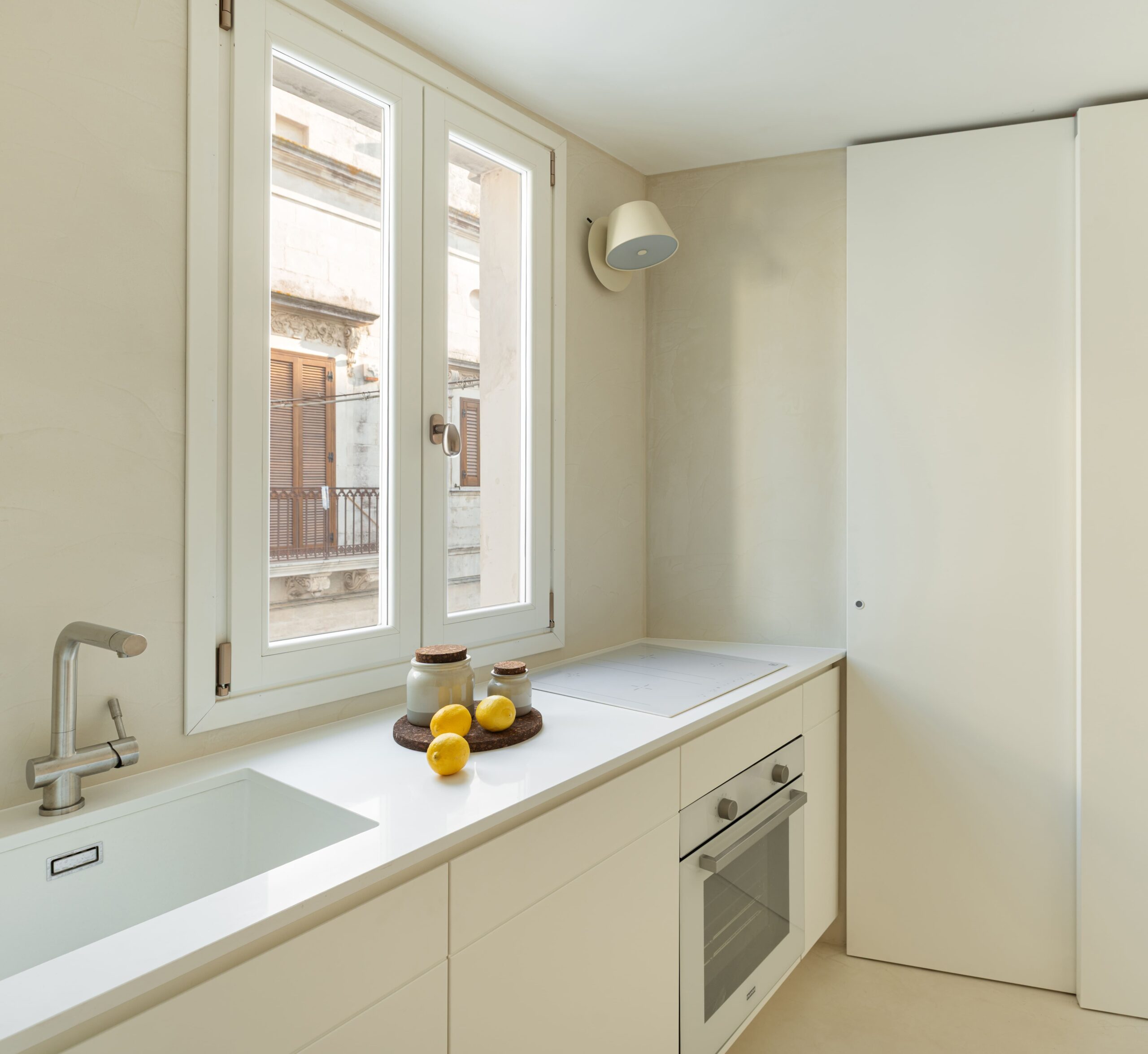 La cucina, moderna e completamente equipaggiata, è un invito alla convivialità: dotata di ogni comfort e pensata per chi ama vivere la dimora in modo autentico, si apre alla luce naturale e ai profumi della Puglia, trasformandosi in uno spazio da vivere, non solo da abitare.