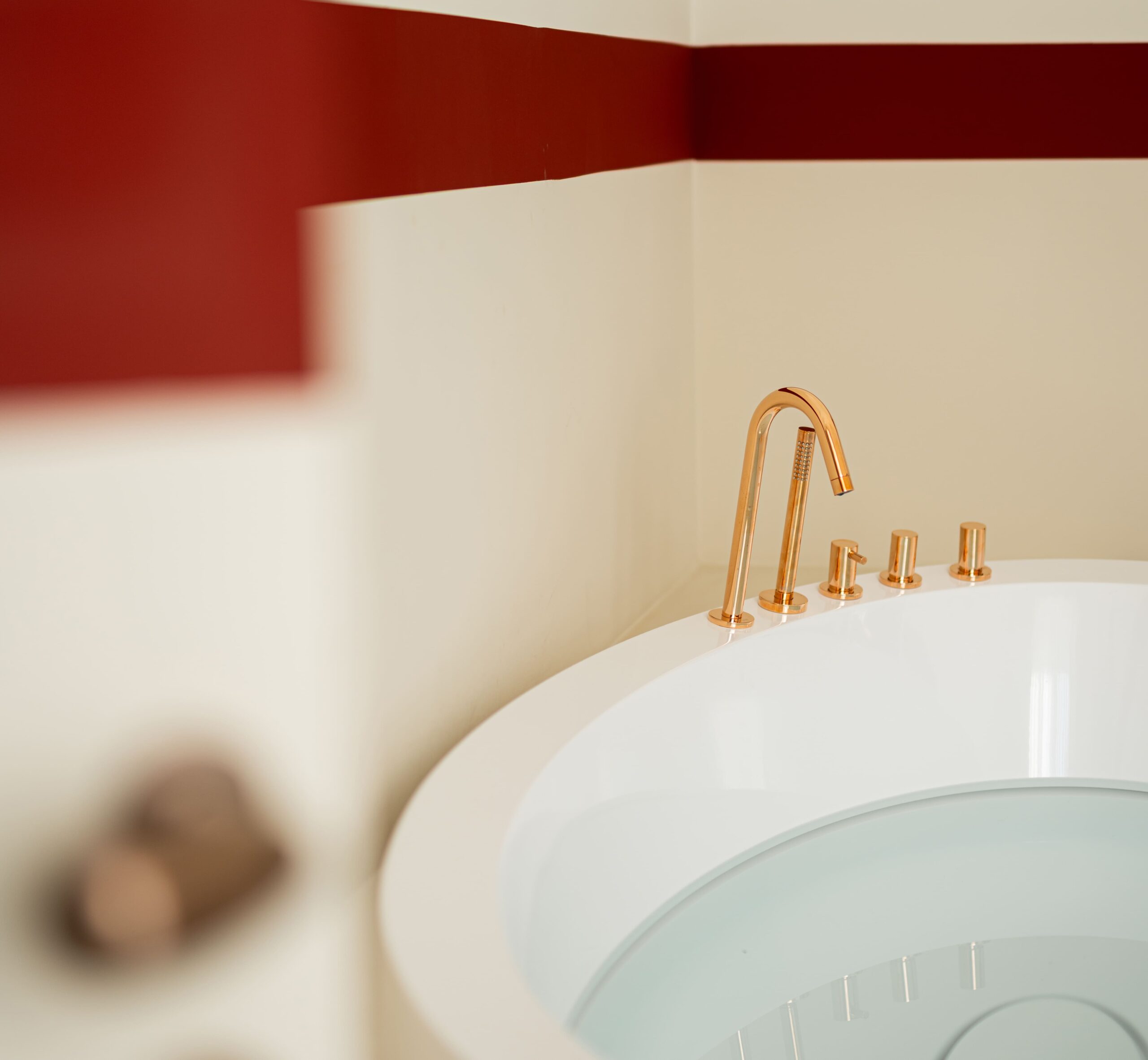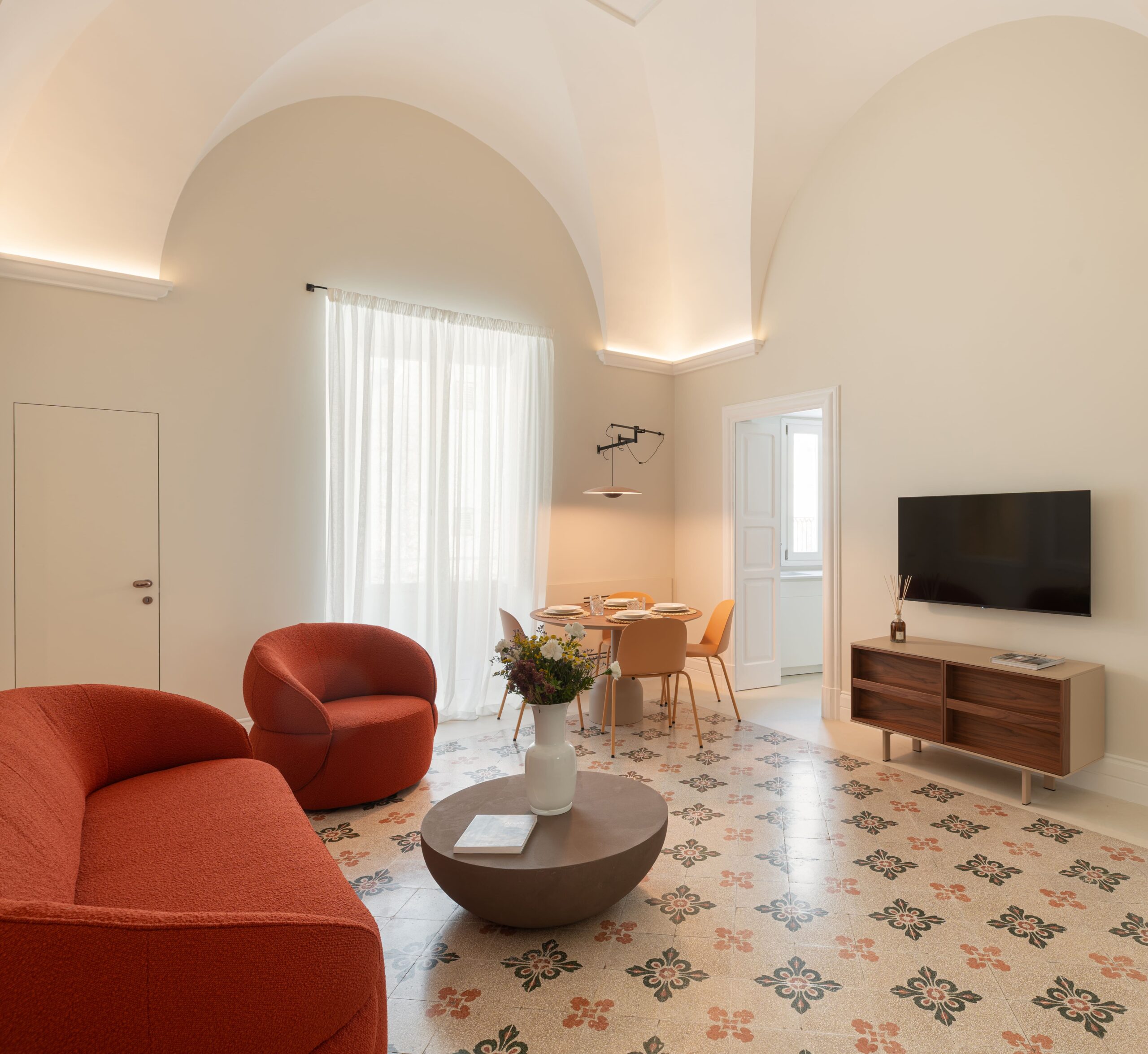 Gli spazi interni di Palazzo Melogna rappresentano la traduzione più autentica del concept progettuale: una fusione armoniosa tra identità pugliese e contemporaneità, dove materiali, colori e arredi dialogano in equilibrio.