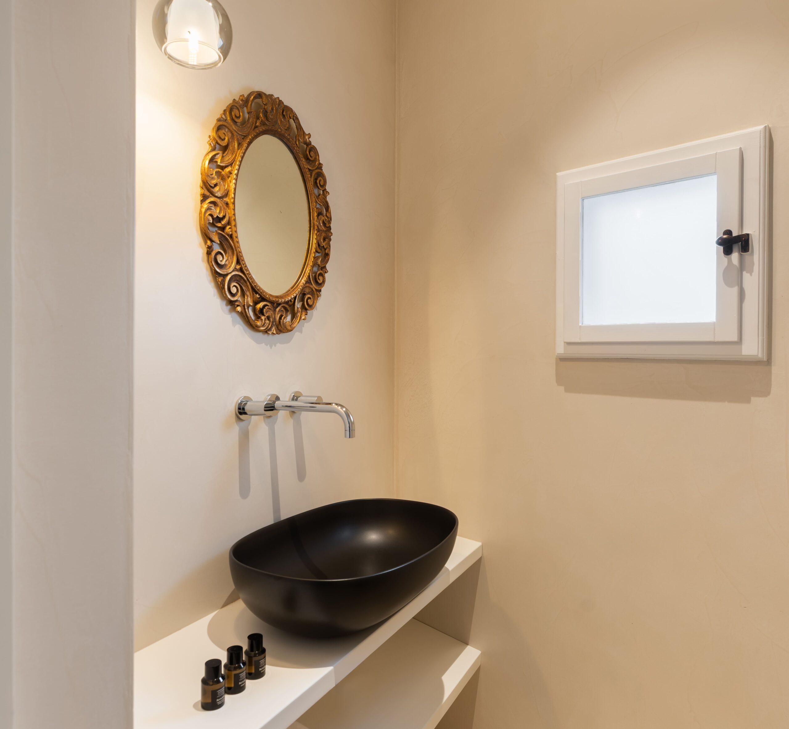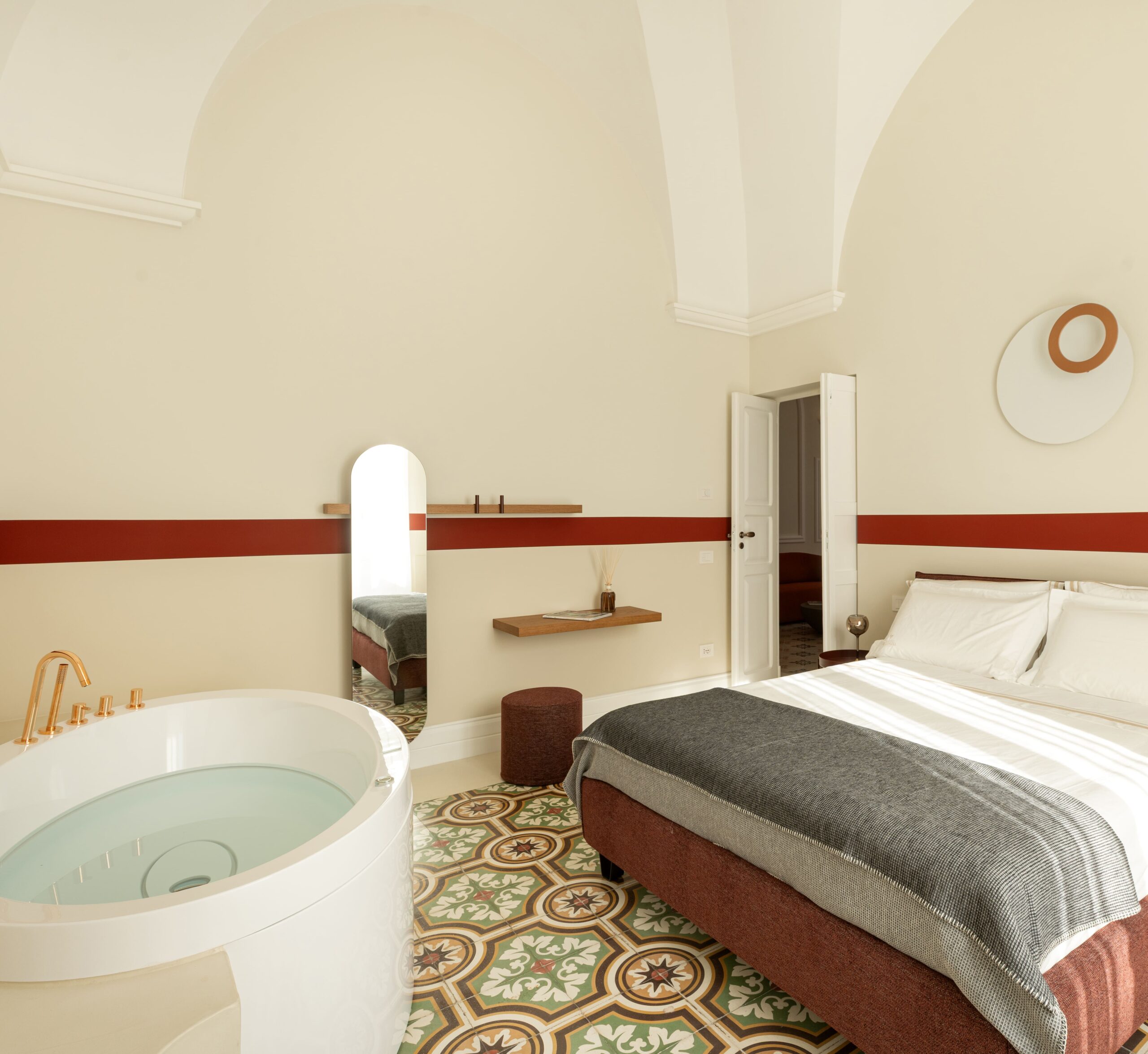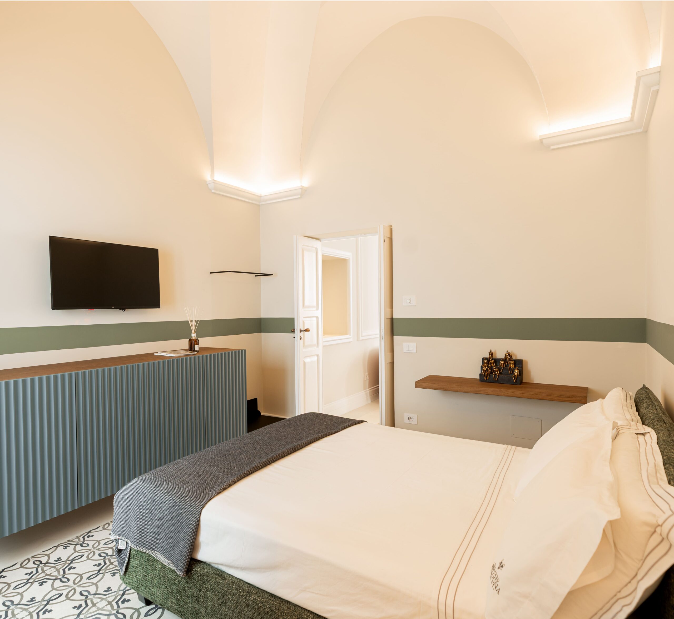 Ogni suite unisce la sobrietà del design contemporaneo al calore delle texture tradizionali, con con soffitti voltati, tonalità neutre e arredi su misura che esaltano la purezza degli ambienti.